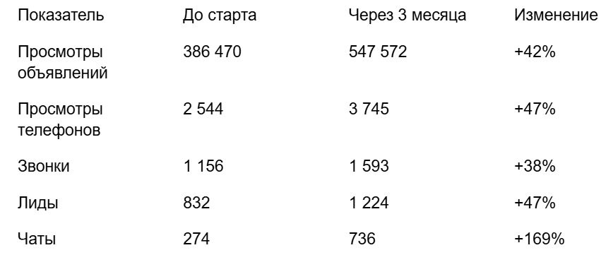 Стоимость контакта снизилась на 35%, стоимость лида — на 21%, а количество лидов выросло на 47%. Благодаря регулярной работе над стоком, анализу конкурентов и объявлений нам удается улучшать результат из месяца в месяц. Клиент получает стабильный поток обращений и оптимизацию расходов без увеличения бюджета на продвижение.