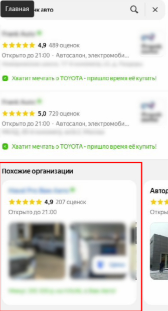 Инструмент «Похожие организации» позволяет показывать компанию в ответ на брендовое решение прямых конкурентов. То есть пользователь набирает в поиске бренд конкурента, а в блоке с организациями рядом появляется карточка дилера «Автопортрет».