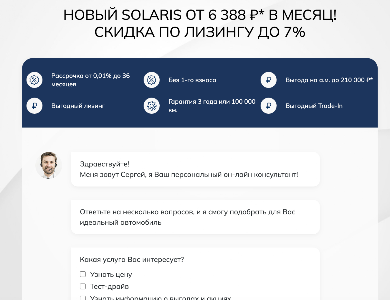 В автобизнесе покупателю часто нужно задать уточняющие вопросы – комплектация, цвет, сроки поставки, трейд-ин и т.д. Чат-формат позволяет это сделать без звонка, снижая порог входа. Кроме того, чат-лендинги обычно дают более высокую вовлеченность и конверсию по сравнению со статичными страницамЧат-лендинг