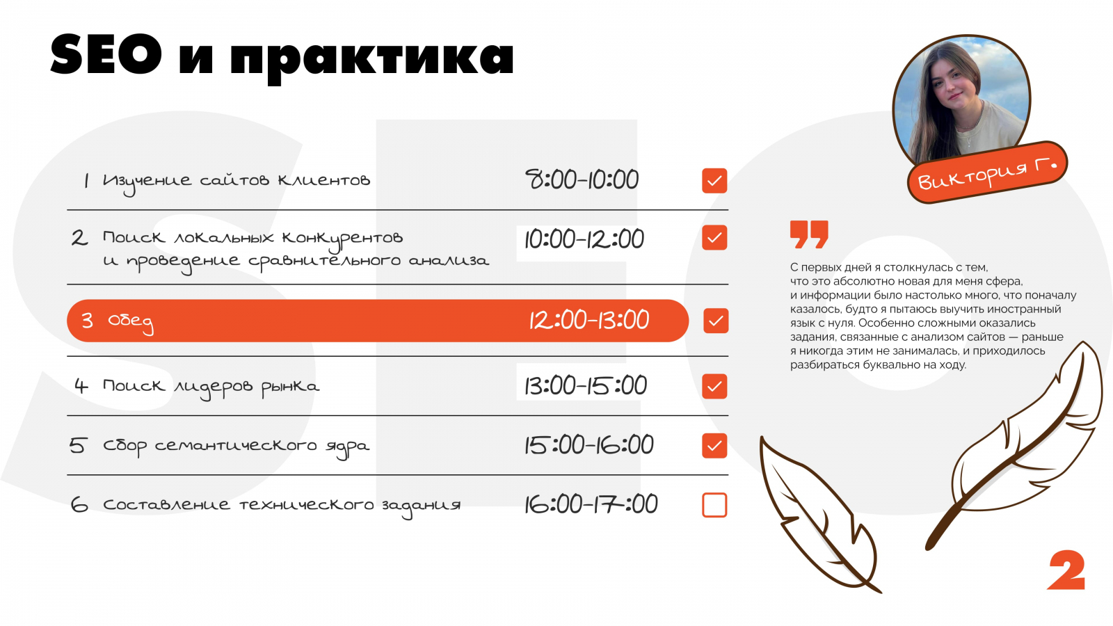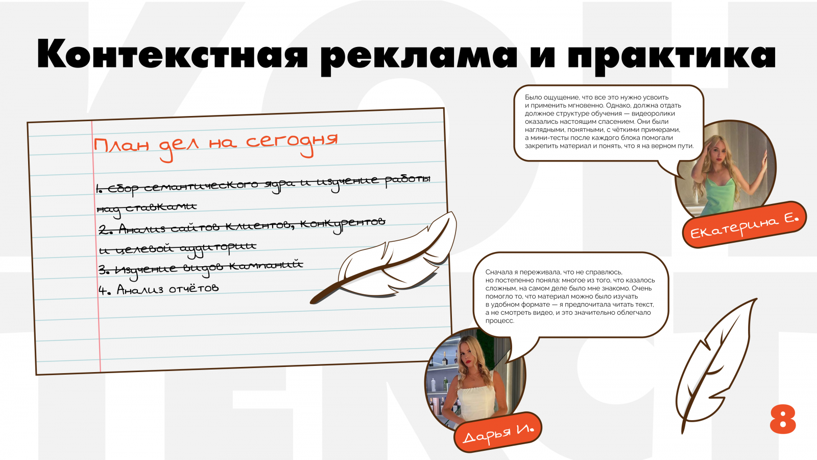 Когда теория сразу подкреплялась практикой, материал усваивался гораздо лучше. Структура обучения была продумана до мелочей: темы давались постепенно, с четкими сроками, а обратная связь по каждому заданию позволяла сразу исправлять ошибки и глубже разбираться в непонятных моментах.