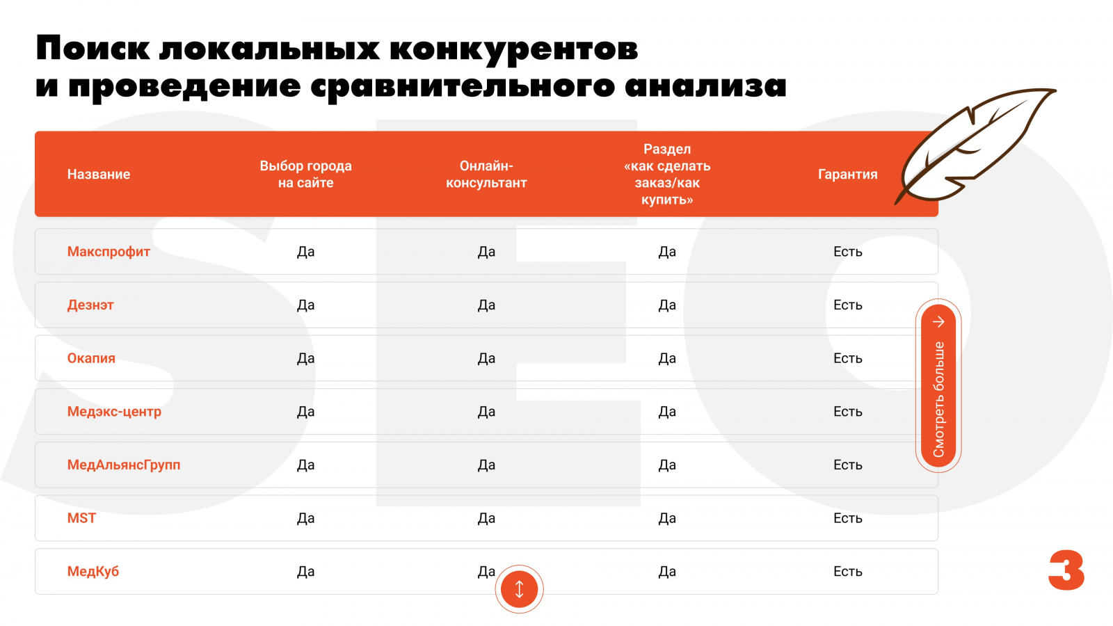 Поиск локальных конкурентов и проведение сравнительного анализа по ключевым элементам сайта (наличие цен, личного кабинета, поиска по сайту и т. д.).