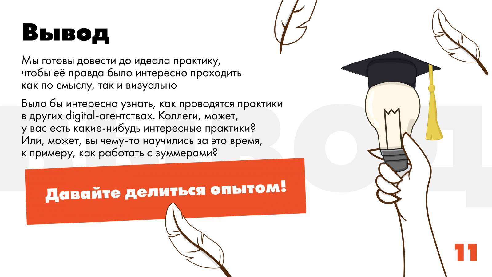 Было бы интересно узнать, как проводятся практики в других digital-агентствах. Коллеги, может, у вас есть какие-нибудь интересные практики? Или, может, вы чему-то научились за это время, к примеру, как работать с зуммерами? (мы уважаем всех, особенно бумеров!)