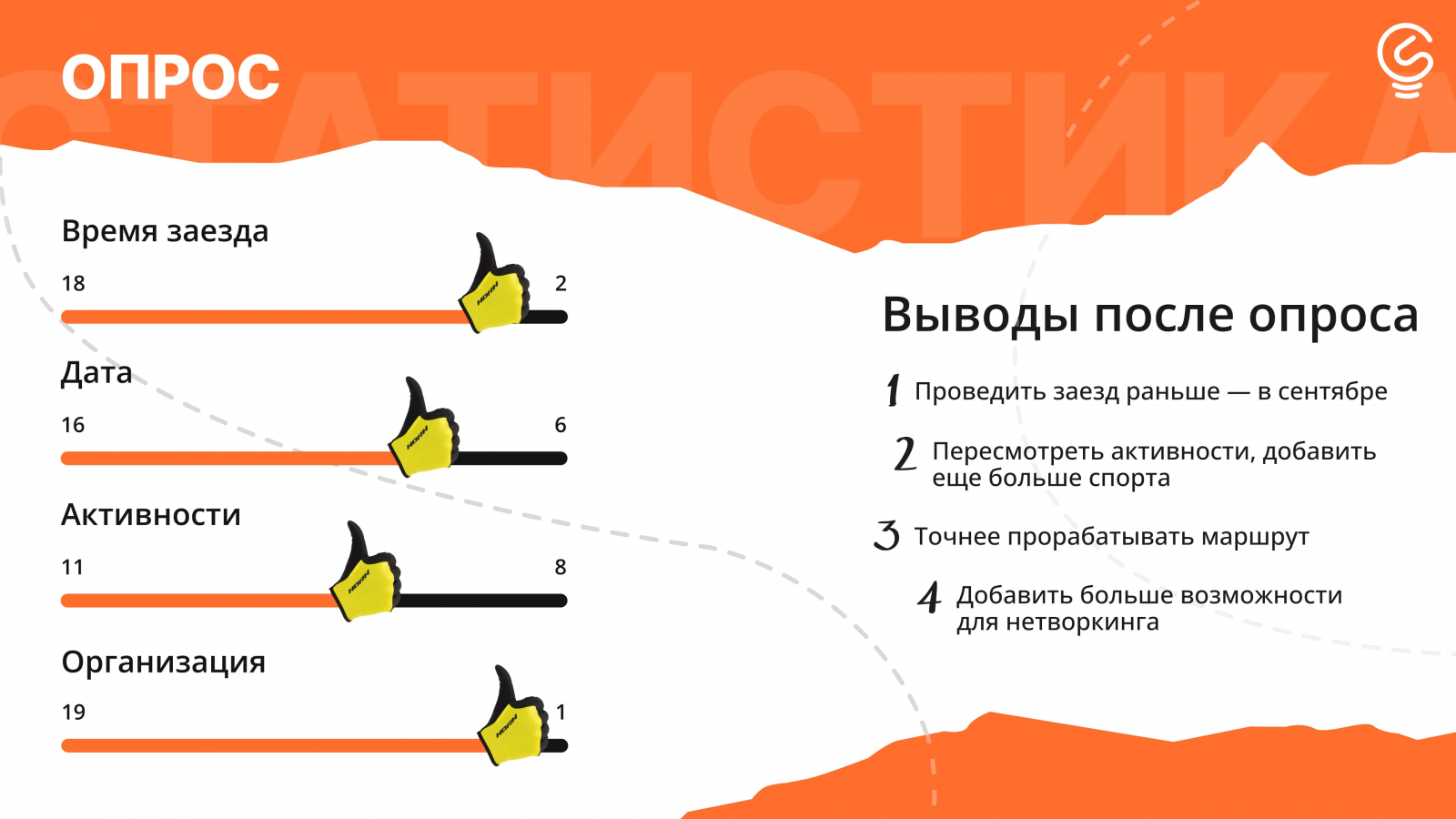 Активности вышли слабоватыми. Вот так, с плеча. Мы и сами это поняли во время заезда, так еще и сверху получили в обратной связи. По итогам опроса 11 понравились активности, 8 назвали их скучными, 4 человека расписали, что хотели бы добавить больше спортивных активностей, таких как волейбол, общая разминка перед заездом, иные спортивные игры.