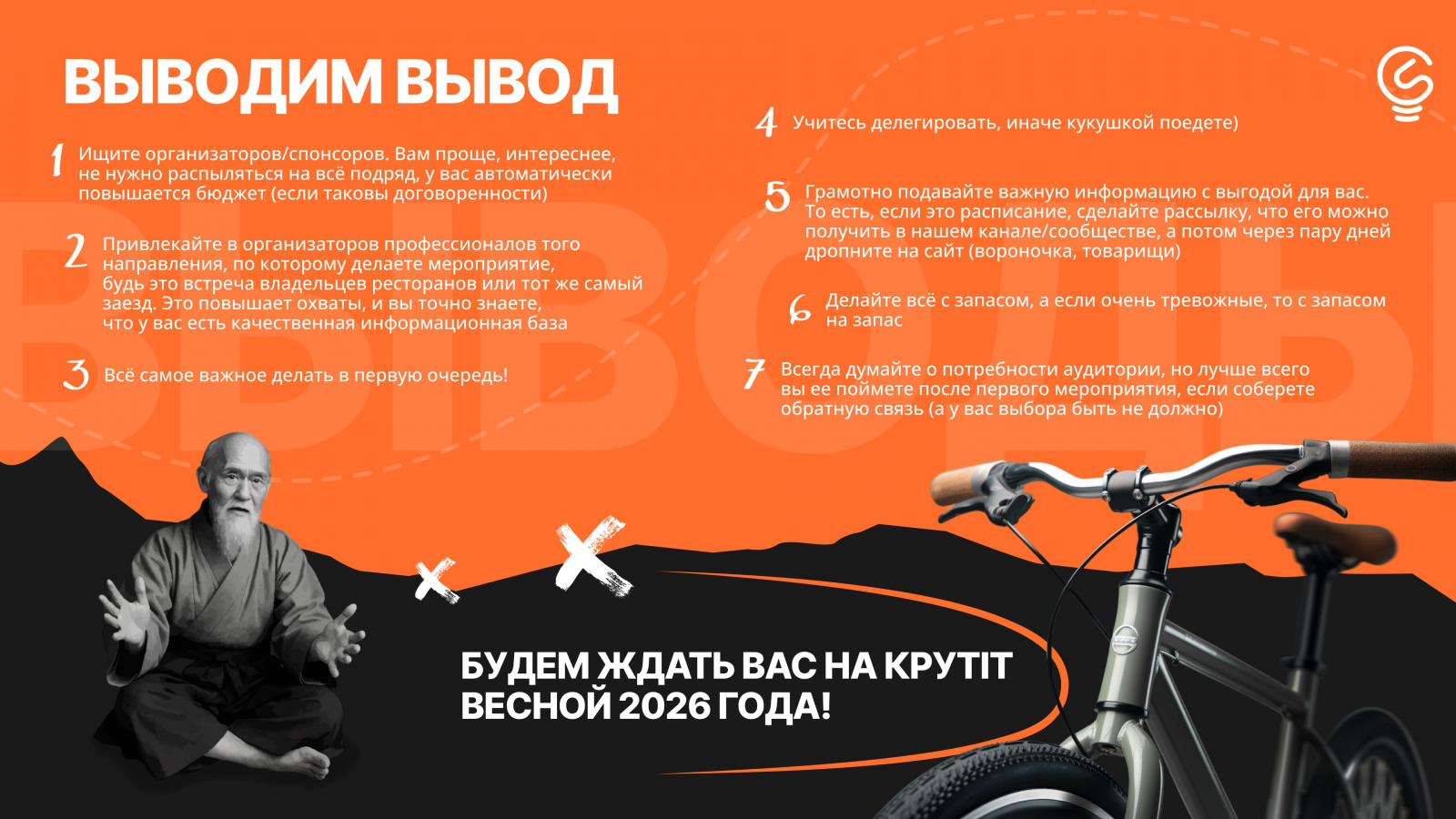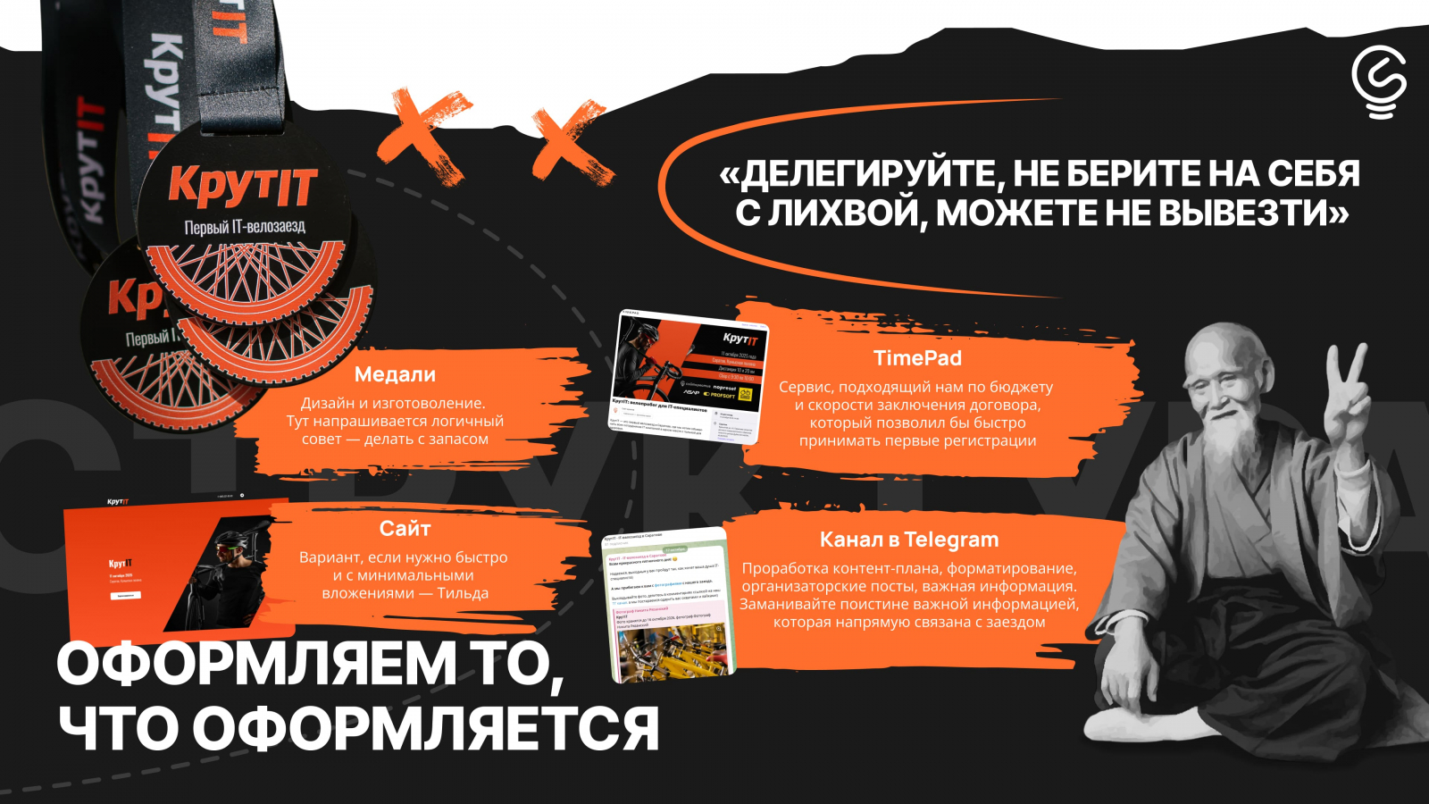Так мы, с поддержкой Алексея Пантелеева, нашли тех самых: Nopreset, ASAP и Profsoft. Мы все айтишники, можем сделать сайт, вести канал и регистрацию, взять всю организацию на себя, а что делать с велосипедами? Совет два: ищите профессионалов в той нише, по которой хотите сделать мероприятие. Это больший охват, вам проще будет заниматься непрофильными вещами, что положительно скажется на организации.