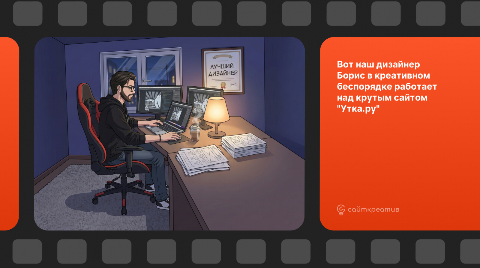 Представим дизайнера, безмерно творческую личность, сидящую в кабинете 2х2 метра в легком креативном беспорядке, работающего в соло и желающего, чтобы его никто не трогал. Окружение и обстановка в целом позволяла творцу создавать отточенной рукой сайты, и как раз сейчас он занимался прорисовкой интерфейса одного из ресурсов, название которому было дано «Утка.ру».