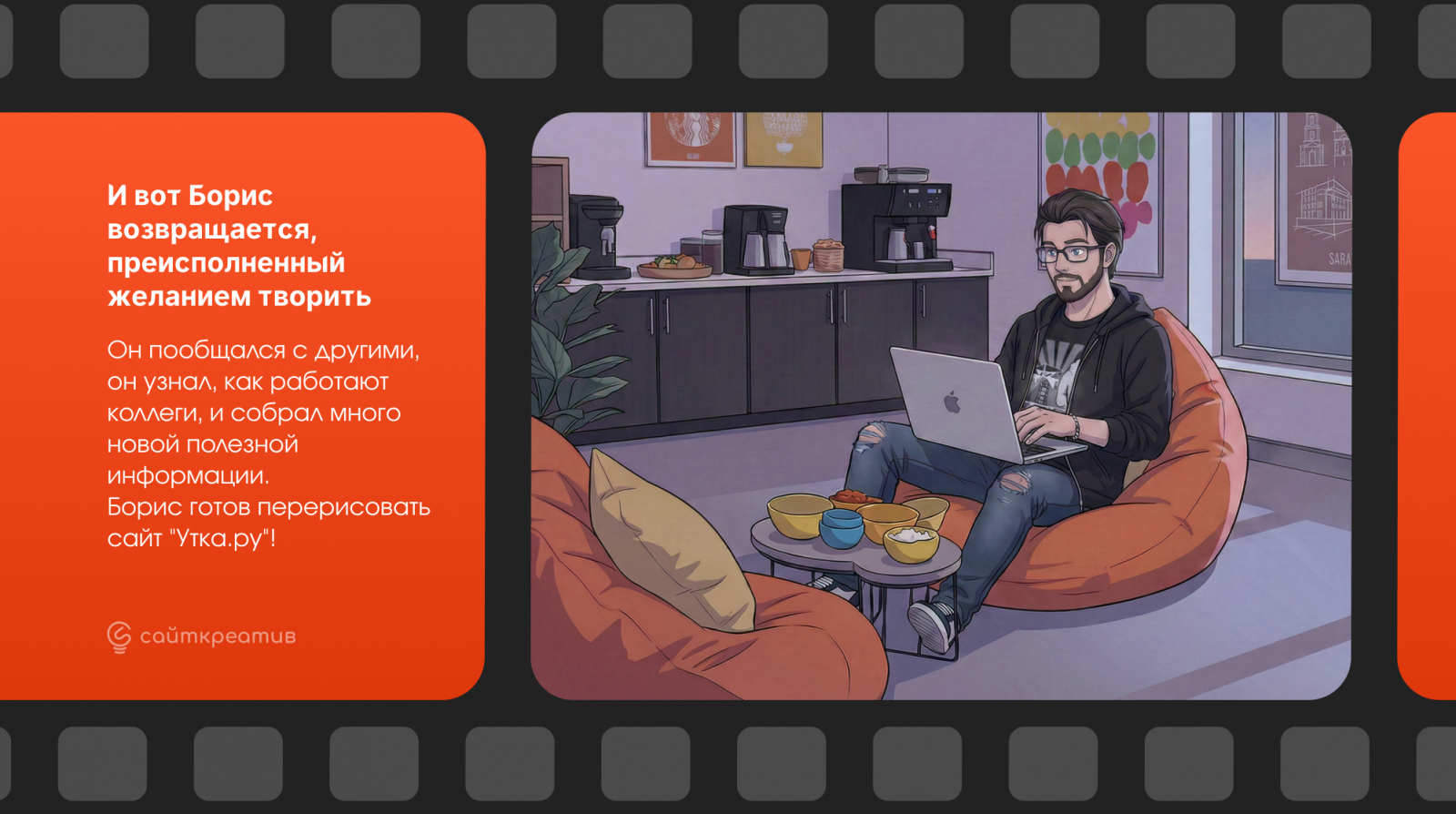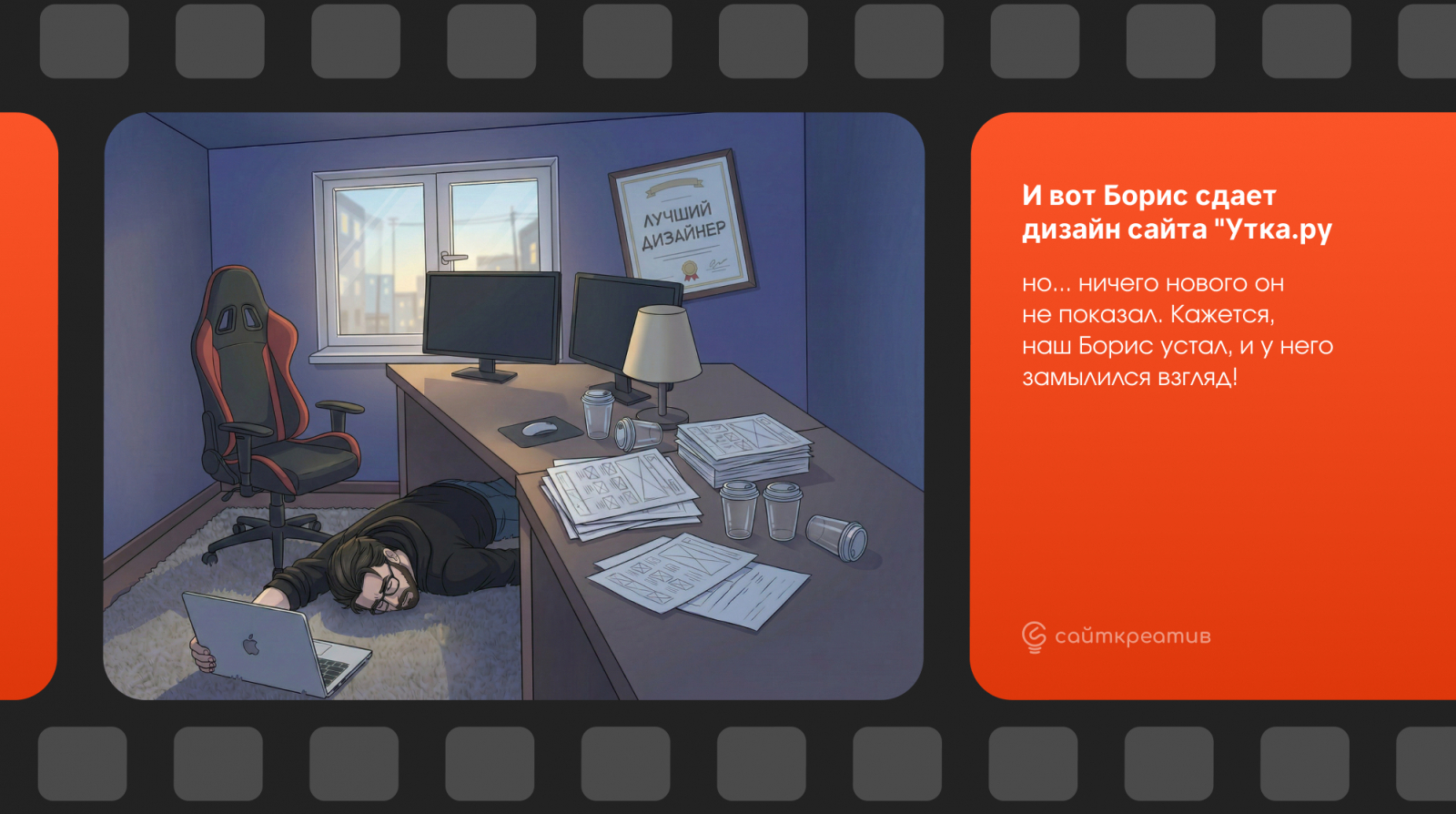 И вот, сидя в своей каморке, наш Борис ловит вдохновение и с головой погружается в проект. Все органы чувств концентрируются, референсы изучаются, конкуренты анализируются, структура адаптируется, и вот-вот он готов выдать свой результат!