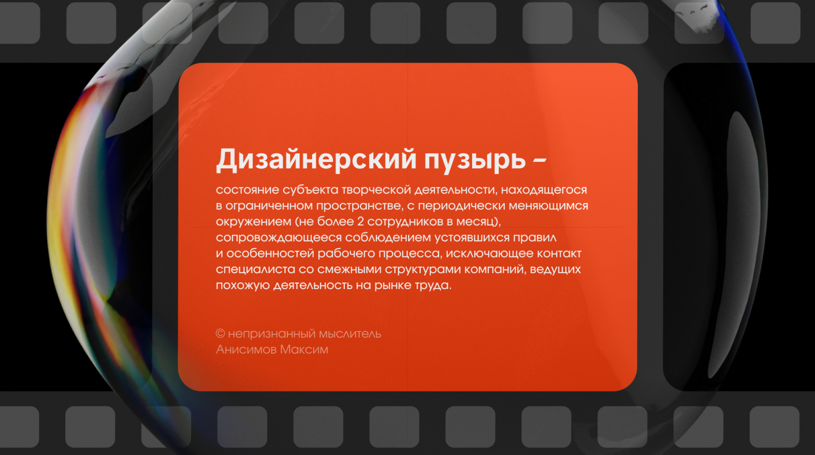 Дизайнерский пузырь — это не про лень, не про выгорание, это про складывающуюся культуру дизайнерской тишины, что свойственна регионам. Мы смотрим на Москву, Питер, Казань и видим тусовки, до которых нам по многим причинам не дотянуться. И если один лопнет этот пузырь, я считаю, что твоя задача сделать также и начать идти вперед.