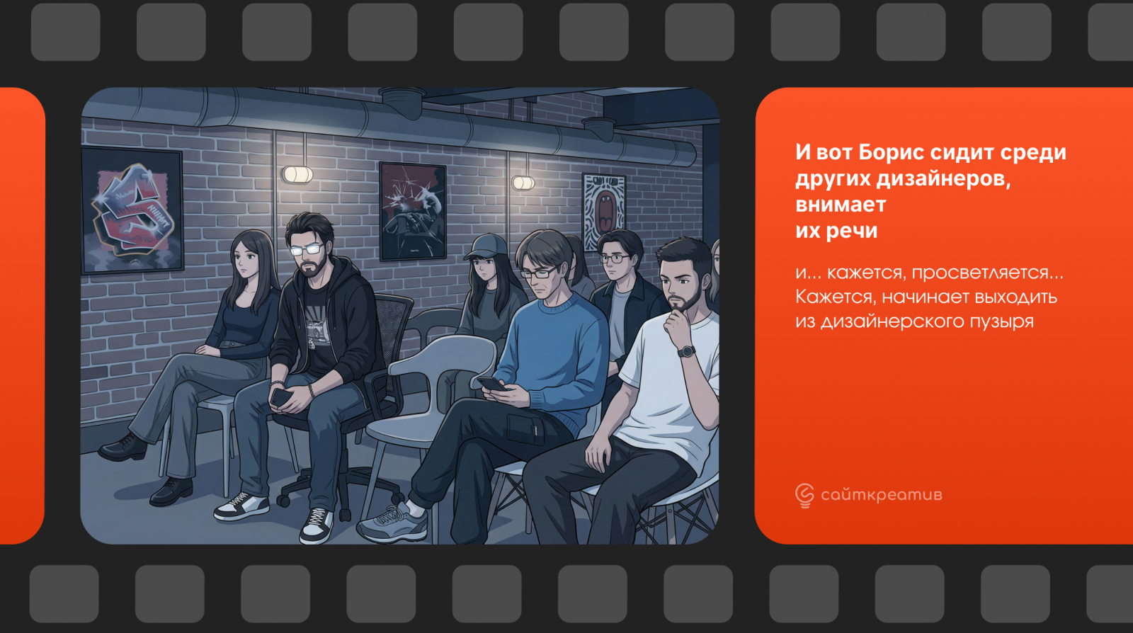 Борис прозрел. Да, ему никто в лицо не сказал, что он гений дизайна, он осознал для себя это сам. Вышагнув на пару часов из своей каморки, он увидел, что в коммуникации с другими дизайнерами, что при обмене опытом можно пробить дизайнерский пузырь и вдохнуть в свой дизайн новую жизнь.