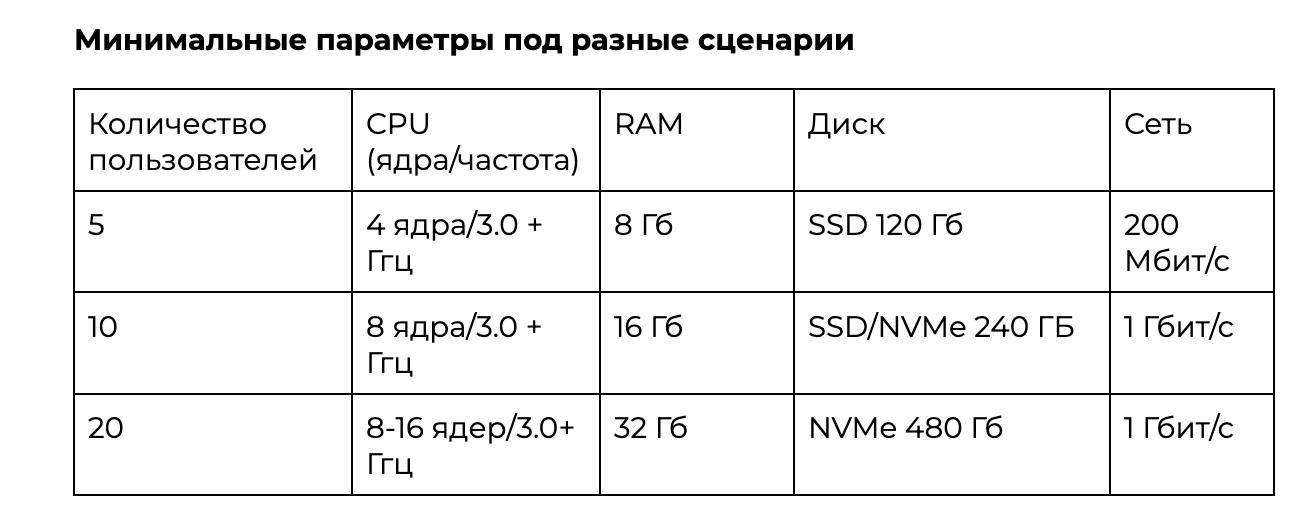 Распространённый сценарий: берут сервер с хорошим процессором, но оставляют 8 ГБ памяти на 10 пользователей. Итог — система уходит в свопинг (начинает использовать диск вместо RAM), и скорость падает в разы. Рекомендованный запас: минимум 30% свободной памяти в часы пик.