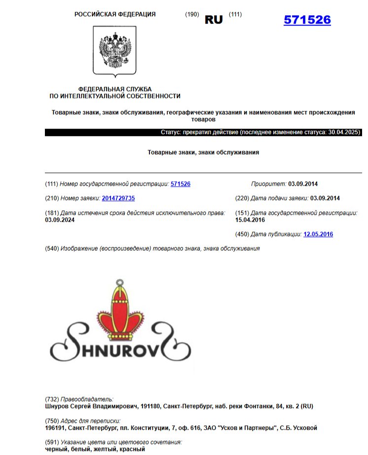 Еще один знак в виде логотипа «ШНУРОВ ШНУРОВ Ш 1973» зарегистрирован в 11 классах МКТУ, в том числе на кружева, шнурки, кожу, канаты, одежду и текстиль.