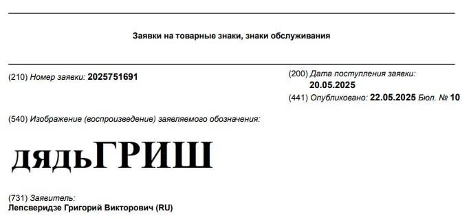 20 мая певец подал в Роспатент заявку на регистрацию товарного знака «дядьГРИШ», а в июне – на бренд «наГЛец».