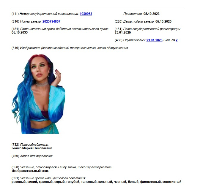 В начале 2025 году стало известно, что певица MIA BOYKA зарегистрировала себя как товарный знак. Точнее, свое изображение с синими волосами.