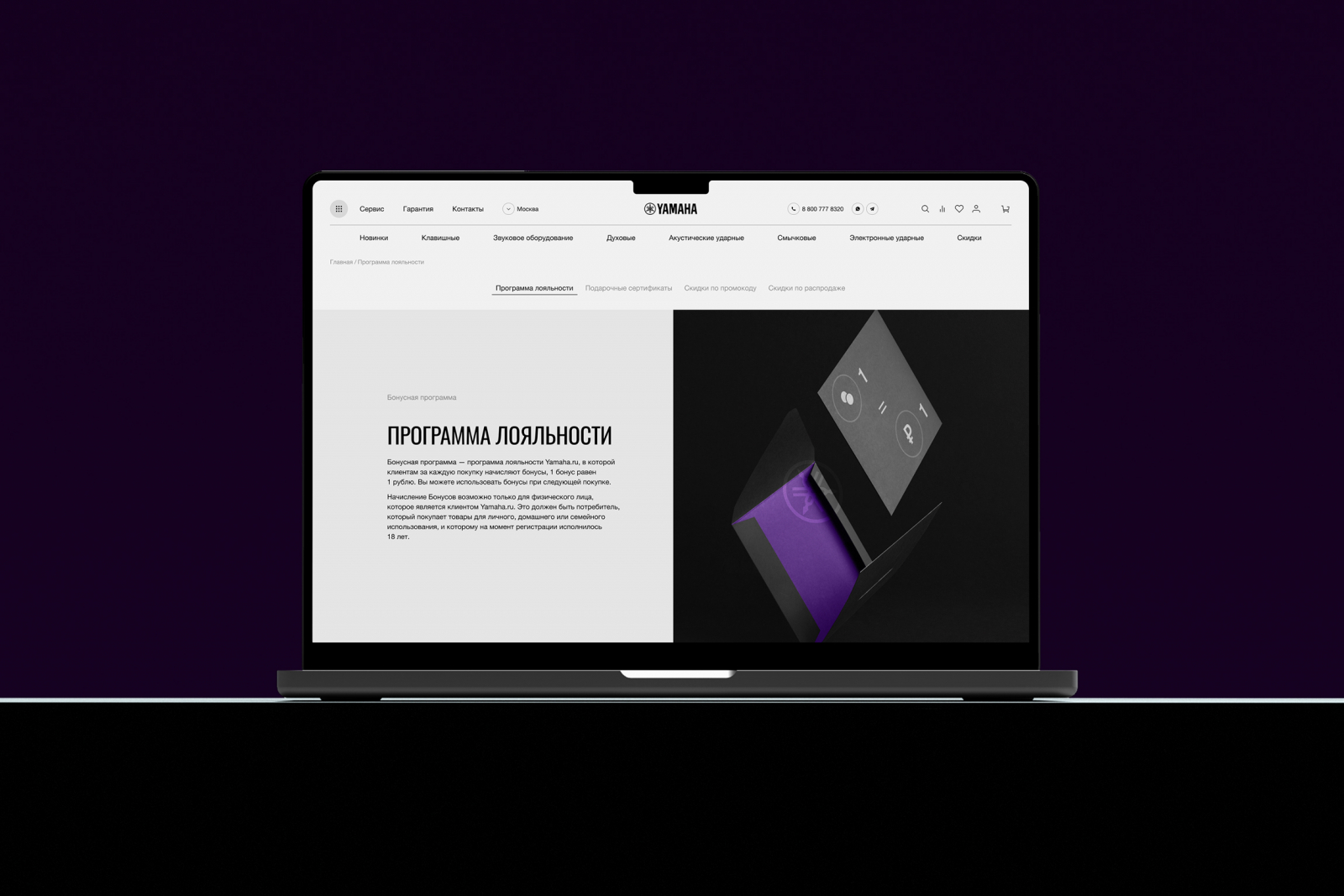 Нашим проектом стал интернет-магазин Yamaha (digital-магазин музыкальных инструментов) с задачей не просто продать, а отразить дух бренда и музыкальную культуру. Так как Yamaha – известный и узнаваемый международный бренд, для нас было важно сохранить его фирменный визуальный язык: цвета, типографику, характер подачи. При этом мы внесли совремённый, более «живой» и динамичный дух, чтобы сайт ощущался актуальным, лёгким и вдохновляющим, но оставался в рамках бренд-гайдов.