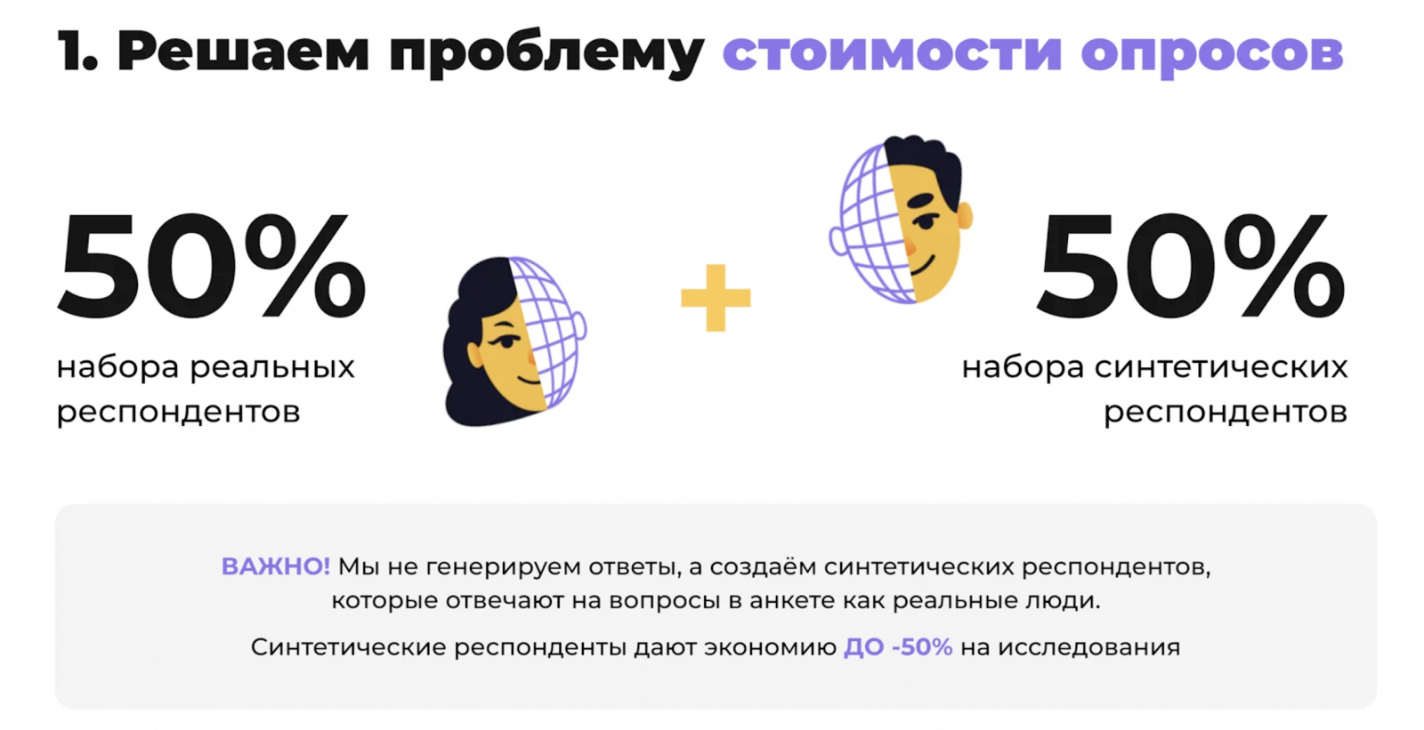 Снижение затрат. Опросы зачастую требуют серьезных инвестиций на поиск и оплату реальных респондентов. Мы предлагаем комбинированный подход: формируем выборку из 50% реальных участников и 50% — синтетических. При этом синтетические респонденты — не просто случайные аватары, а цифровые участники, которые заполняют анкету вдумчиво и в соответствии с заданными параметрами, приближаясь по качеству к реальным людям. Такой подход позволяет сэкономить до 50% расходов на исследования, не теряя достоверности данных.