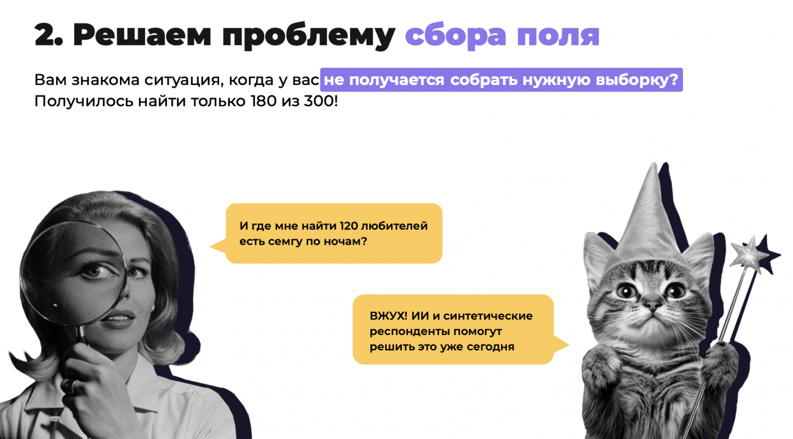 Оперативный сбор поля. Все чаще выполнение плана по набору респондентов становится непростой задачей: многие не готовы отвечать на анкеты, а нужные сегменты крайне редки. Если когда-нибудь вы сталкивались с невозможностью найти нужное количество участников или получить отклик от «экзотических» аудиторий — теперь этот вопрос закрыт. Искусственный интеллект способен смоделировать поведение даже самой редкой аудитории, обеспечивая полноту данных быстро, экономно и с должным качеством. Процесс сбора данных становится управляемым и прогнозируемым.