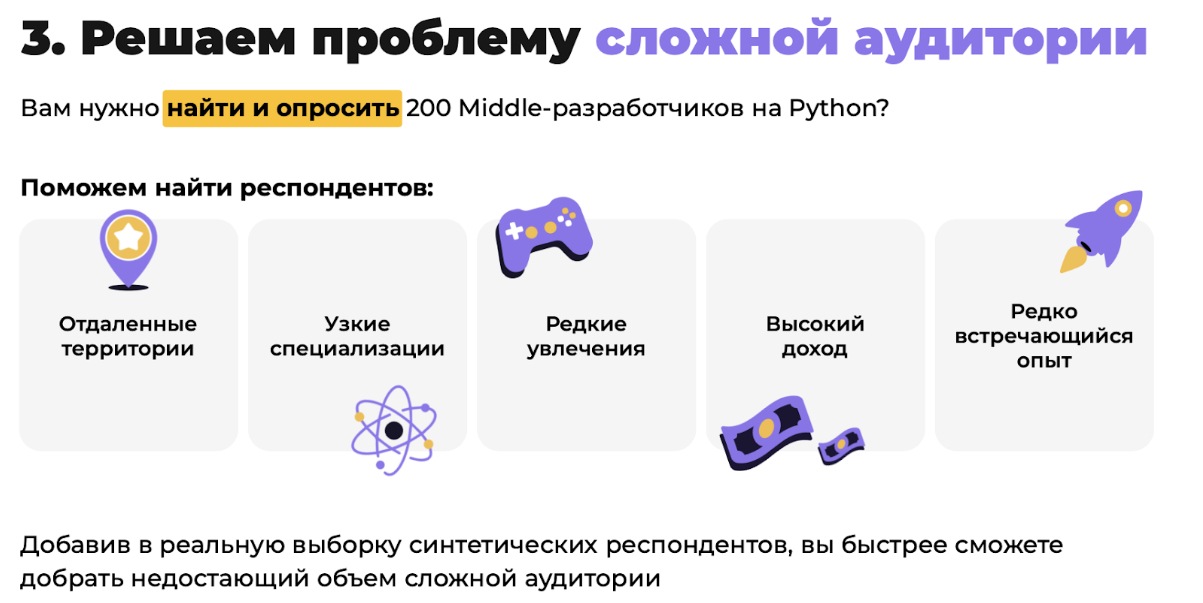 Поиск специализированных респондентов. Опросить, к примеру, 200 разработчиков Python уровня middle или людей с узкими интересами и высоким доходом зачастую невозможно через классические методы. Объединив реальных и синтетических участников, мы ускоряем набор аудитории для самых сложных сегментов, не жертвуя качеством и репрезентативностью. Особенно это ценно для труднодоступных регионов и уникальных профессиональных групп.