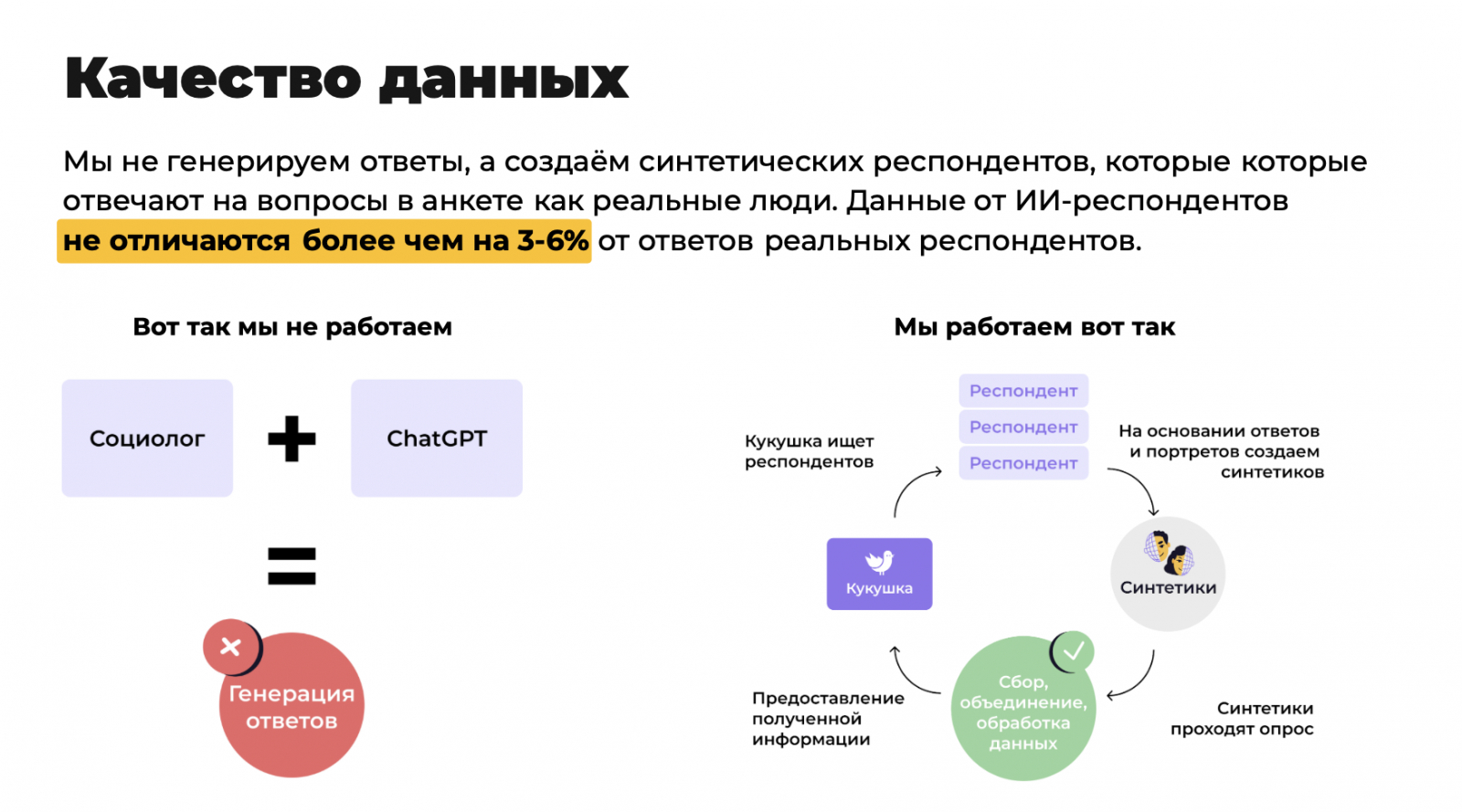Мы придерживаемся принципиального отношения к качеству данных: не просто генерируем случайные ответы, а выстраиваем полноценную симуляцию. Сначала мы собираем ответы от настоящих представителей нужной аудитории, а затем на их основе строим профили синтетических респондентов с учетом полученных особенностей. Эти виртуальные участники затем также проходят анкетирование — в результате данные максимально близки к реальным опросам.