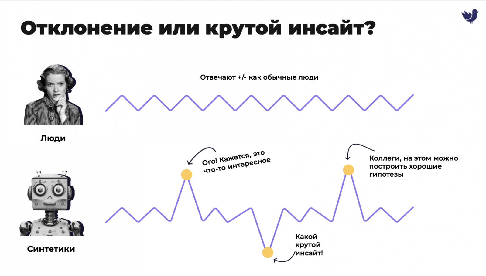 Ошибочно считать, что только люди способны предложить неожиданные идеи — синтетические респонденты, как показала практика, тоже вносят ценный вклад в формирование нестандартных гипотез. В обычных анкетах большинство предпочитает стандартные ответы, а редкие нестандартные мнения часто теряются на фоне «средних» результатов. Синтетики же способны выявить нетривиальные варианты, которые реальный участник мог бы упустить или не осознать сразу. В этом — главное преимущество: использование синтетических данных помогает подсветить незамеченные ранее возможности.