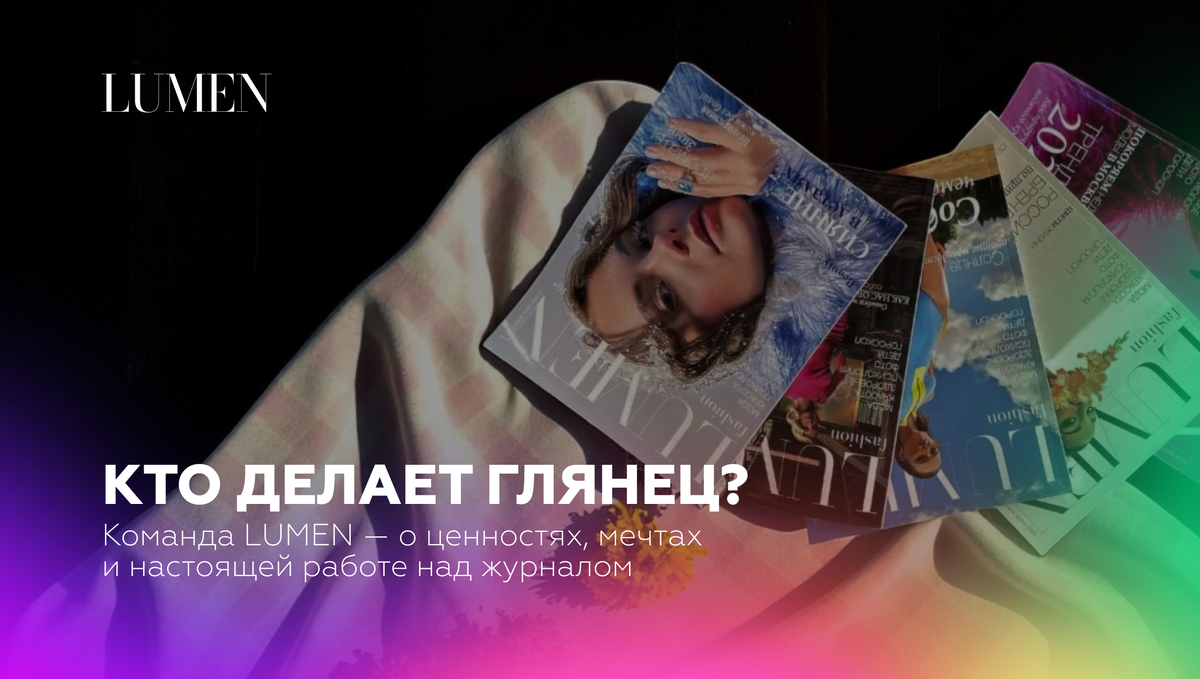 Мы решили показать, кто и как создаёт наш журнал. Главный редактор, который верит в «мурашки» от каждой статьи. Дизайнер, который упаковывает философию в визуальный язык. Продюсер, который соединяет творчество и логистику. И ещё много важных ролей — без которых LUMEN был бы другим. Хотите заглянуть за кулисы глянца? Тогда обо всем по порядку.