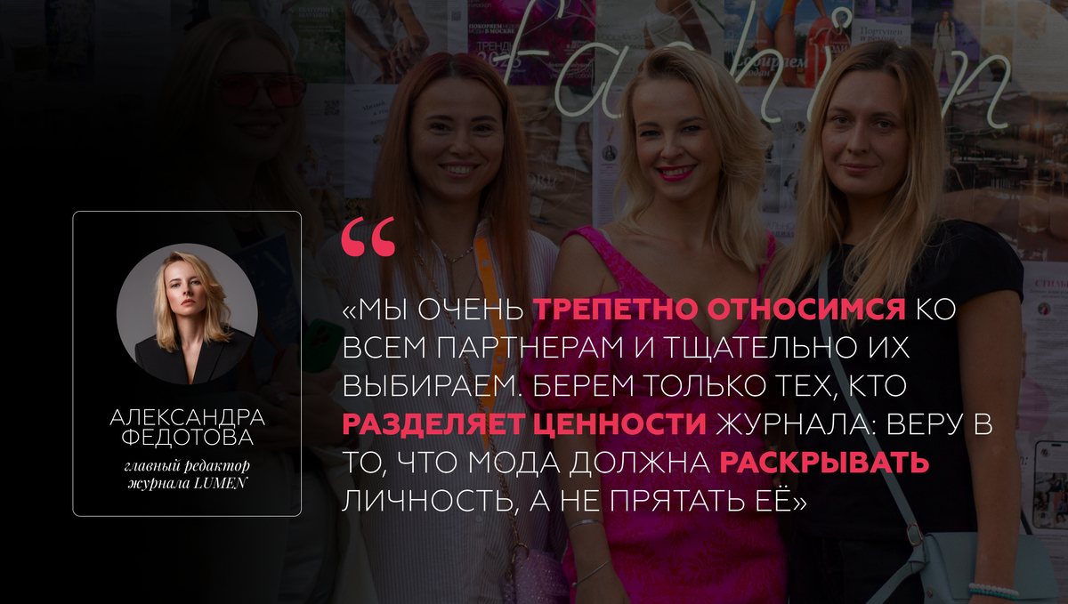 В LUMEN партнерства — это не контракты, а сотворчество. Елена, менеджер по коллаборациям, ищет не просто бренды, а единомышленников — тех, кто готов стать частью философии издания.