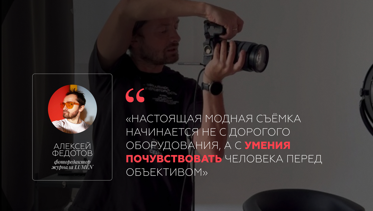 Алексей Федотов — фоторедактор журнала LUMEN. В его работе нет случайных кадров — каждый снимок — это история, где героиня не просто позирует, а по-настоящему раскрывается.