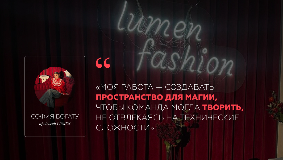 Благодаря её таланту соединять вдохновение с логистикой, каждый номер LUMEN выходит точно в срок, сохраняя при этом ту самую искренность и глубину, ради которых и создаётся журнал. Для неё продюсирование — не просто организация процессов, а искусство создавать условия, в которых рождается настоящее.