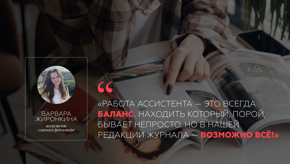 Если главный редактор — это мозг издания, то ассистент — его сердце.Варвара не просто организовывает встречи и следит за дедлайнами: она превращает творческий хаос в работающую систему. В её работе соединяется воедино структура: графики, планы и таблицы с творчеством: идеи, PR-проекты, мероприятия.
