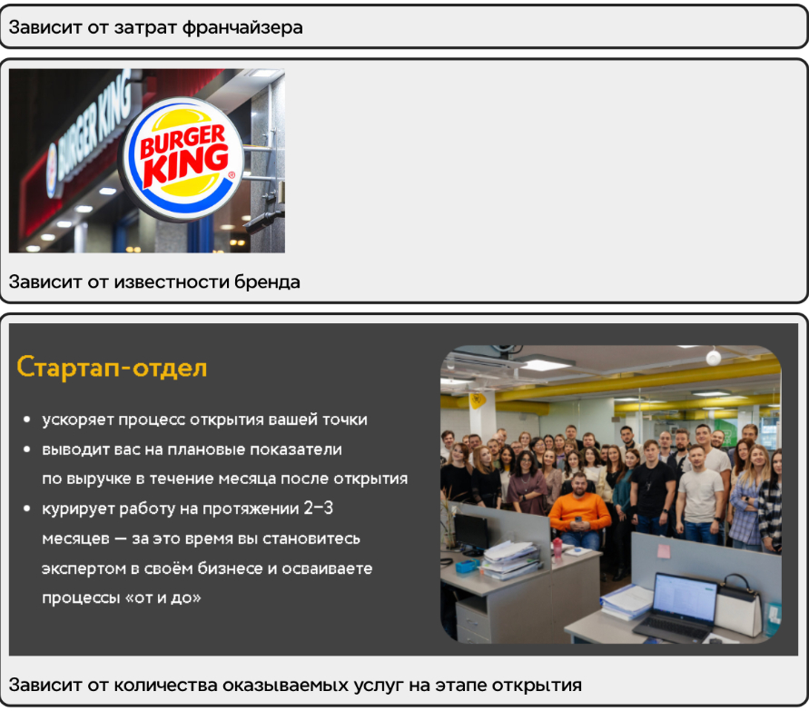 Франчайзер может сам вести первые 2–3 точки вручную, а может с самого начала строить инфраструктуру, нанимать людей и закладывать это в стоимость входа.