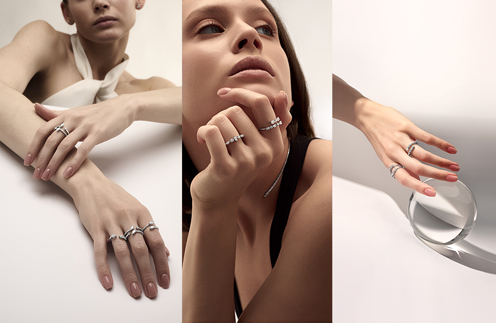 В коллекции драгоценные камни намеренно противопоставлены движению линии, создавая выразительное напряжение. Такое расположение освобождает бриллианты от визуального доминирования металла и позволяет им существовать более независимо. Каждая огранка раскрыта максимально открыто, позволяя свету свободно проходить через камень и усиливать его присутствие.