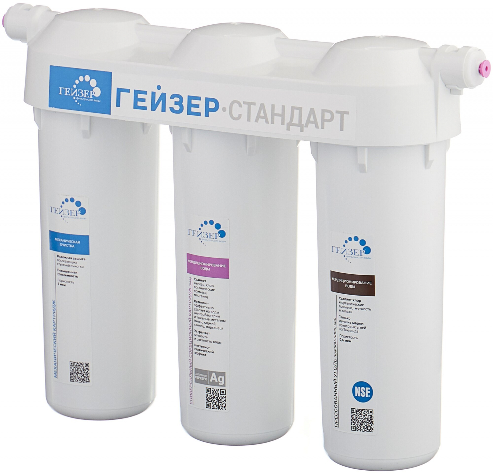 В типовом исполнении предлагаются комплекты из трех блоков. Их основные особенности такие же, как и у одиночных картриджных фильтров для воды грубой и тонкой очистки в Леруа Мерлен. Главное отличие – меньшая производительность по сравнению с магистральными системами водоподготовки. Бренды Гейзер (Стандарт, Био, Ультра Био), Барьер (Эксперт, Профи) широко представлены в этой торговой сети.
