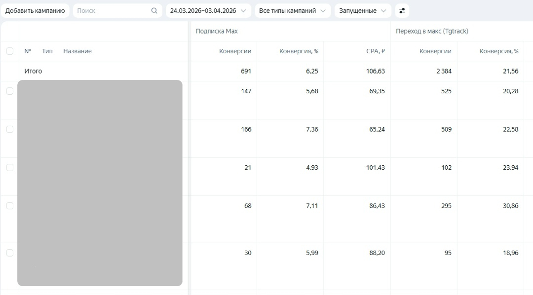 Изначально мы хорошо работали с ТГ. Запускали трафик и раскачали канал с 14 000 до 41 000 подписчиков. Но потом столкнулись с проблемой — ТГ заблокировали. Мы не стали ждать и оперативно перевели трафик на подписку канала на в MAX через Яндекс Директ.