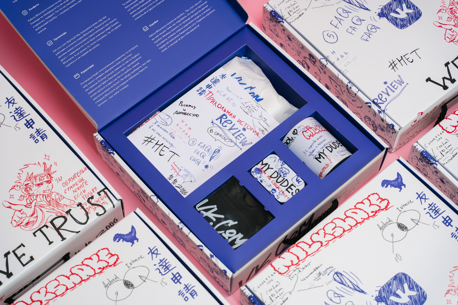 ВКонтакте помимо бесплатных подписок на свои сервисы дарят дизайнерские боксы с мерчем, наклейками, кружками и полезными мелочами для работы и досуга.
