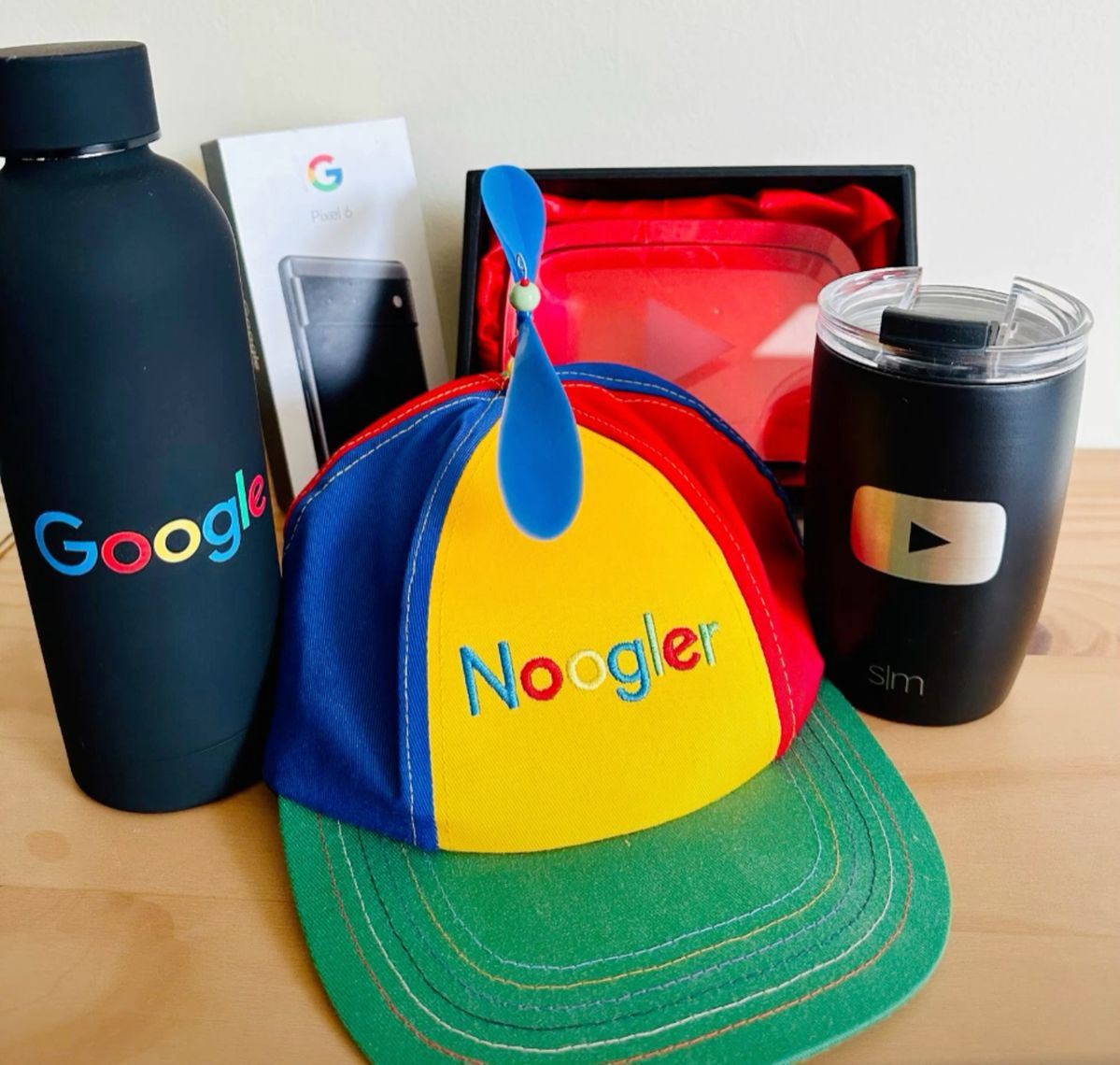 Google в разных странах и от разных подразделений дарит новичкам разные наборы: с канцелярией, зонтом, бейсболкой с вентилятором, полотенцем, мягкой игрушкой, толстовкой, VR-очками и сертификатом Google Play. В некоторых странах даже добавляют игрушечный пистолет для офисных игр.