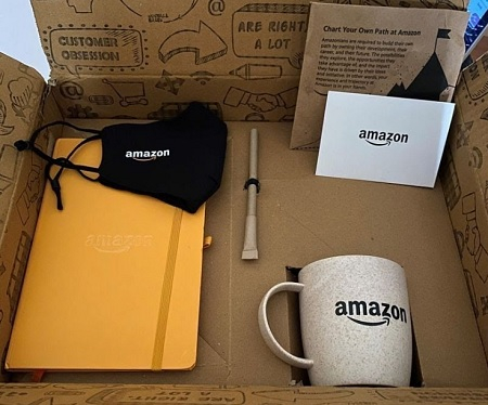 Amazon позиционирует себя как эко-френдли: кружка и блокнот из переработанных материалов, биоразлагаемая ручка, маска с логотипом и персонализированное письмо.