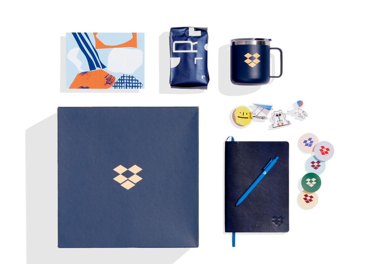 Dropbox делает акцент на продуктивности: качественный кофе, стильный брендированный блокнот и немного юмора в дизайне.