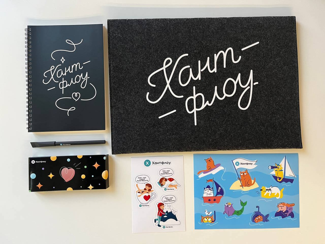 Хантфлоу делает акцент на практичности: чехол для ноутбука, канцелярия, стикерпак и шоколадка. И даже новый дизайн носков.