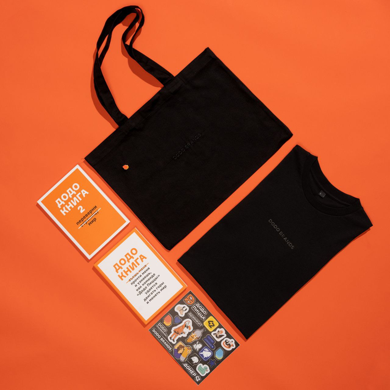 Dodo Brands выбирают минимализм: чёрная футболка, вместительный чёрный шопер, стикерпак, пин и две «Додо Книги» основателя компании. Обновляют наборы ежегодно.