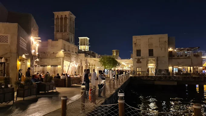 Район на берегу ручья (Dubai Creek), где арабская архитектура соседствует с современными решениями. Здесь можно прокатиться на традиционной лодке абра, попробовать уличную еду, купить местные специи или сувениры, и при этом насладиться спокойной атмосферой старого города. Вечером всё это подсвечивается тёплым светом, напоминая сцены из восточных сказок.