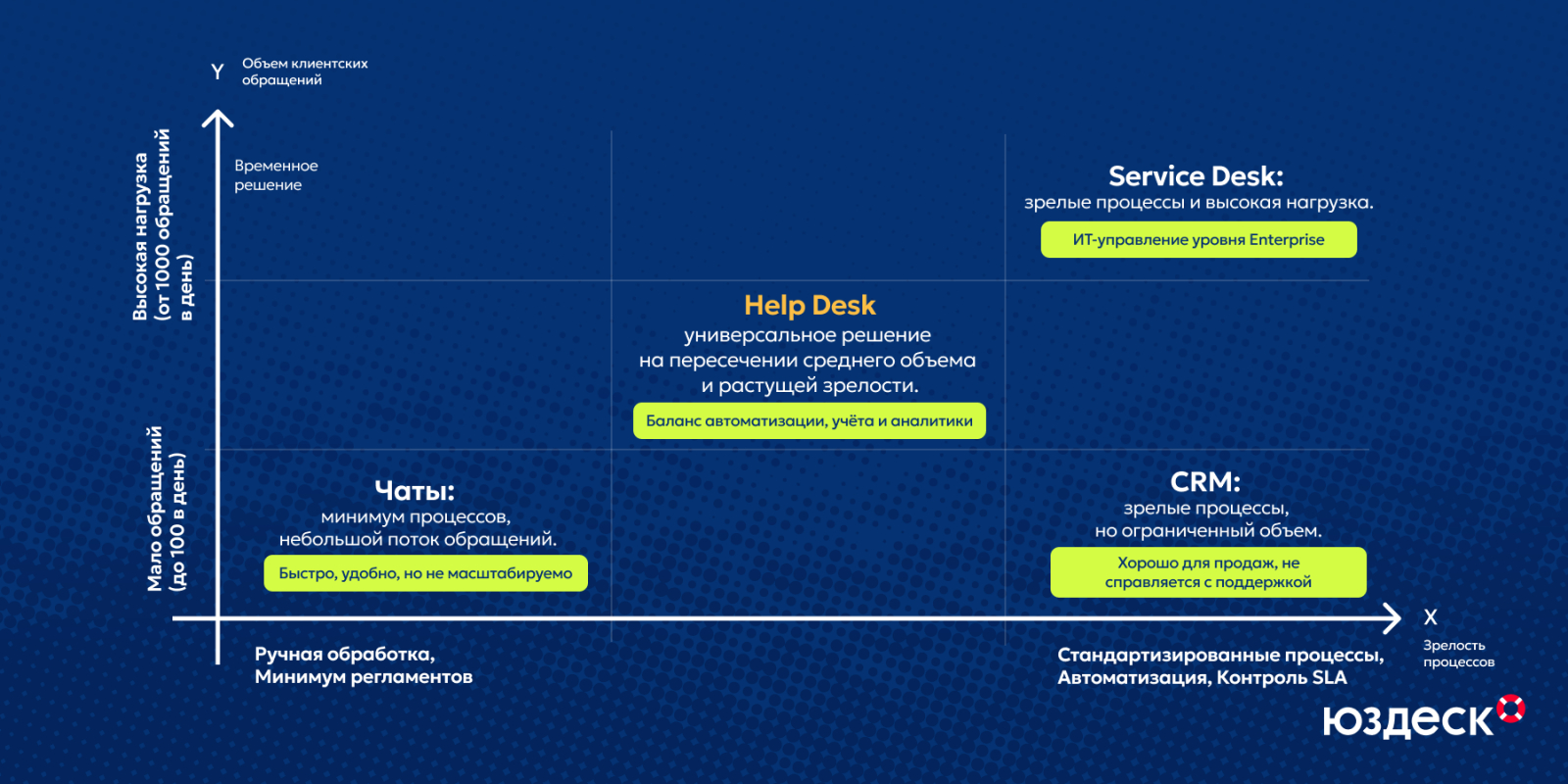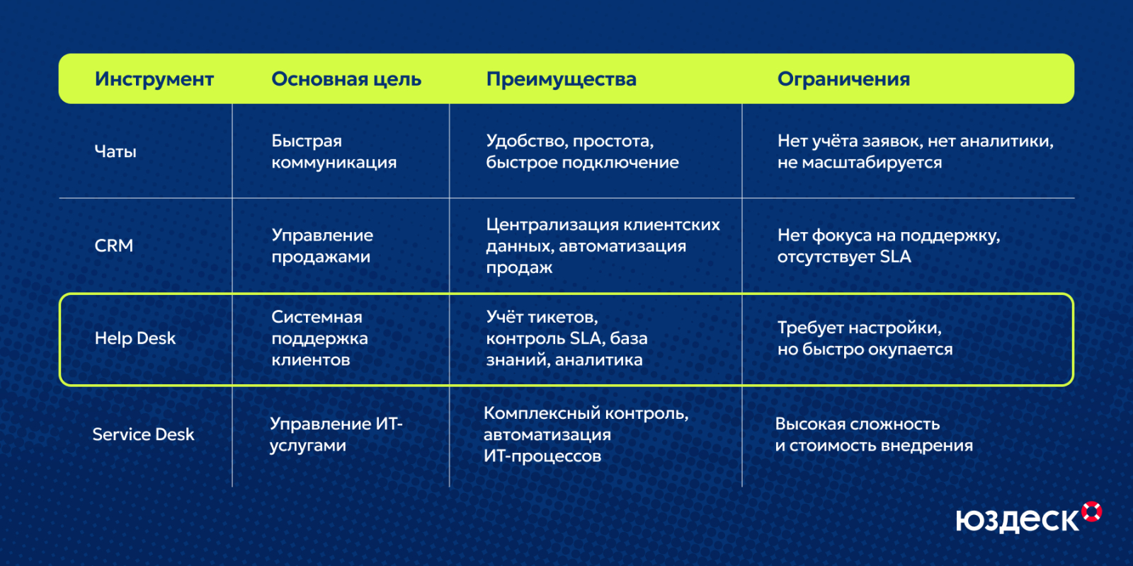 Каждое из решений, которые мы разобрали в материале, подходит для своей задачи. Для постройки стабильной и масштабируемой клиентской поддержки оптимальным выбором будет именно хелпдеск. Он легко адаптируется под рост компании, даёт руководству прозрачную аналитику и помогает команде сфокусироваться на сути — решении задач клиента — без серьезных трат времени и денег.