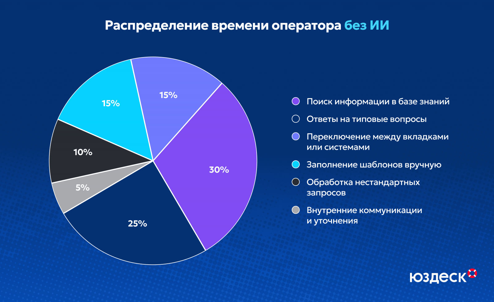 В повседневной работе службы поддержки львиная доля времени уходит не на сложные кейсы, а на повторяющиеся действия: ответ на типовые вопросы, ручной поиск информации, переключение между вкладками, формулировку однообразных фраз. Каждый день на эти задачи может уходить до четырех часов из восьми рабочих. При этом такие задачи не требуют высокой квалификации, но отнимают часы операторского времени и снижает концентрацию.Именно здесь искусственный интеллект приносит первую заметную пользу.