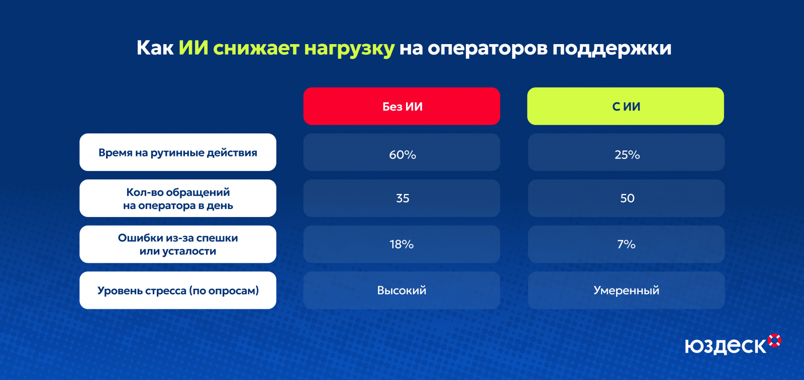 Чем выше загрузка, тем больше «микродосад» в работе: нужно срочно найти ответ, переключиться между системами, успеть до таймера. В таких условиях уходит энергия даже на простые действия.ИИ берёт на себя часть этой нагрузки. Он работает как «второй мозг» оператора: