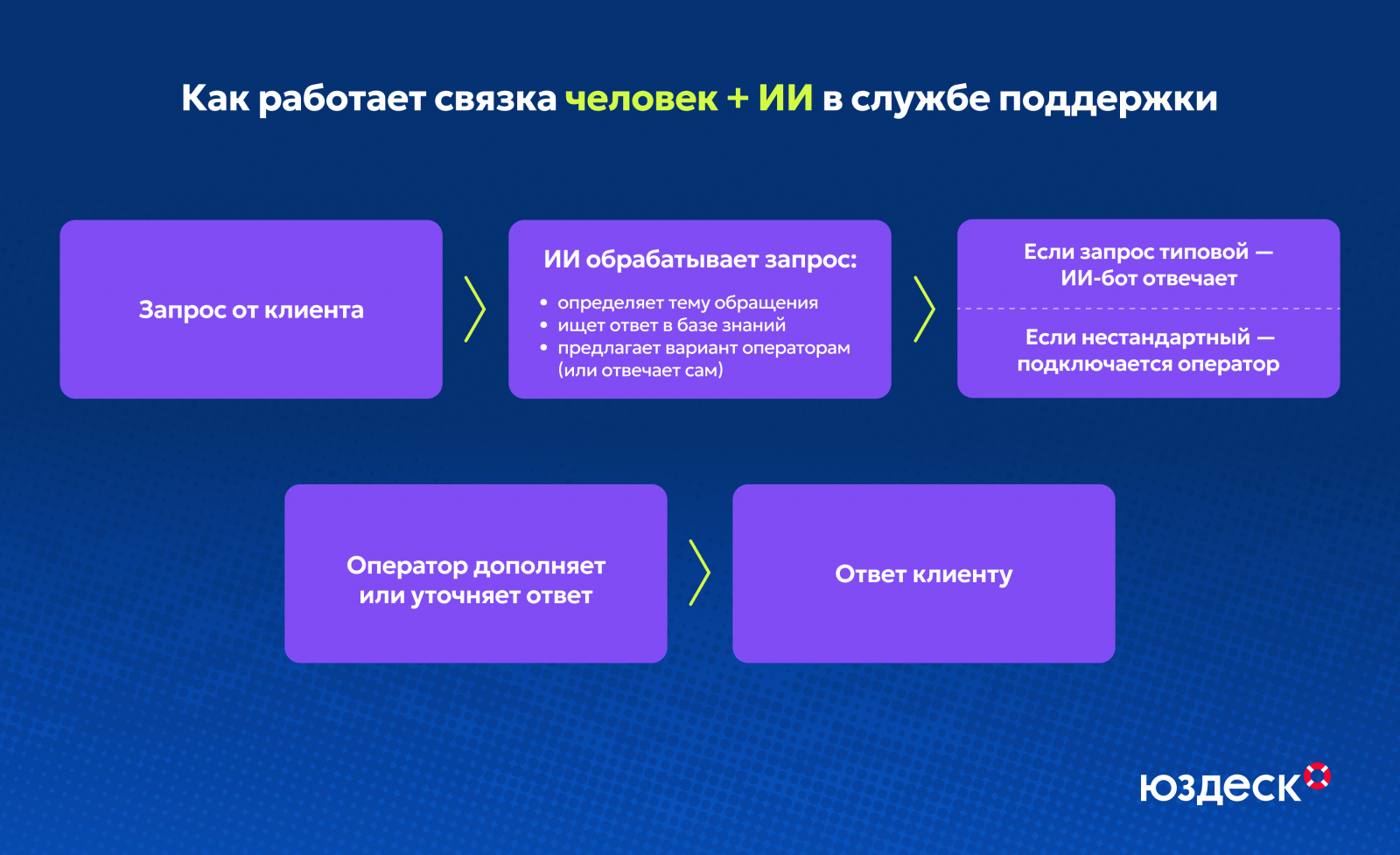 ИИ помогает радикально сократить время отклика. В связке с оператором он может: