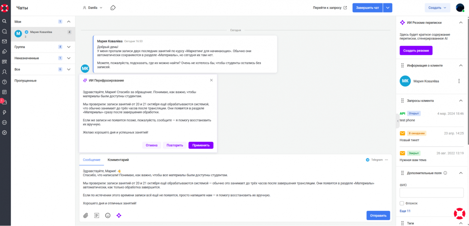 На иллюстрации выше — работа функции «ИИ-Перефразирование» в интерфейсе Юздеска 2.0. Оператор отвечает клиенту, сообщившей о пропавших записях занятий. Система предлагает отредактированный вариант текста: делает его чище и структурнее, сохраняя смысл и тон общения.
