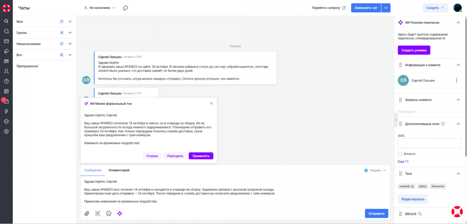 В этом примере оператор отвечает клиенту, уточняющему сроки доставки заказа. ИИ-помощник предлагает переписать сообщение в менее формальном тоне — сделать его понятнее и дружелюбнее, сохранив точность информации.