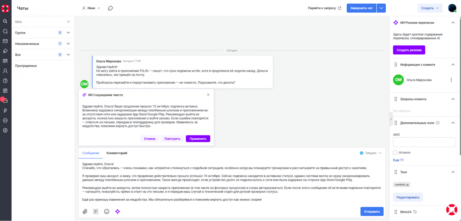 Готовый вариант текста появляется прямо в окне диалога: оператор может применить его, повторить генерацию или внести свои правки.