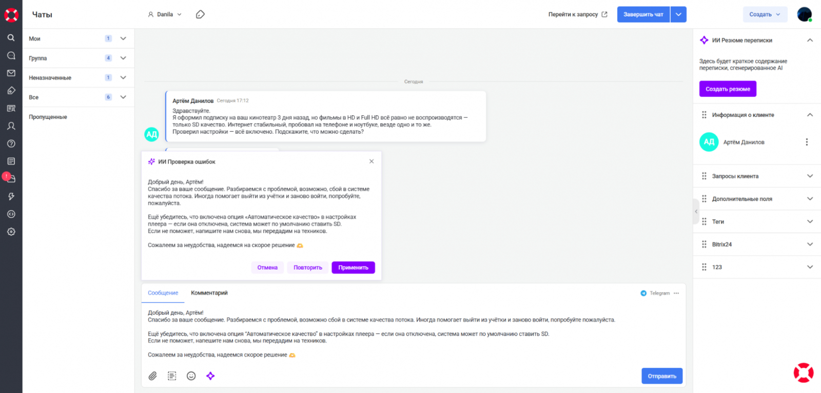 Клиент сообщает о проблеме с качеством видео, и оператор готовит ответ. С помощью ИИ-помощника оператор запускает функцию «Проверку ошибок» — она анализирует текст и предлагает исправленный, более аккуратный вариант без опечаток и лишних повторов.