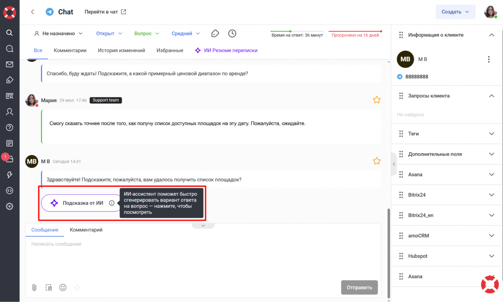 Подсказка от ИИ помогает агенту не тратить время на формулировку ответа. Она появляется прямо в карточке запроса и предлагает готовый вариант сообщения клиенту.