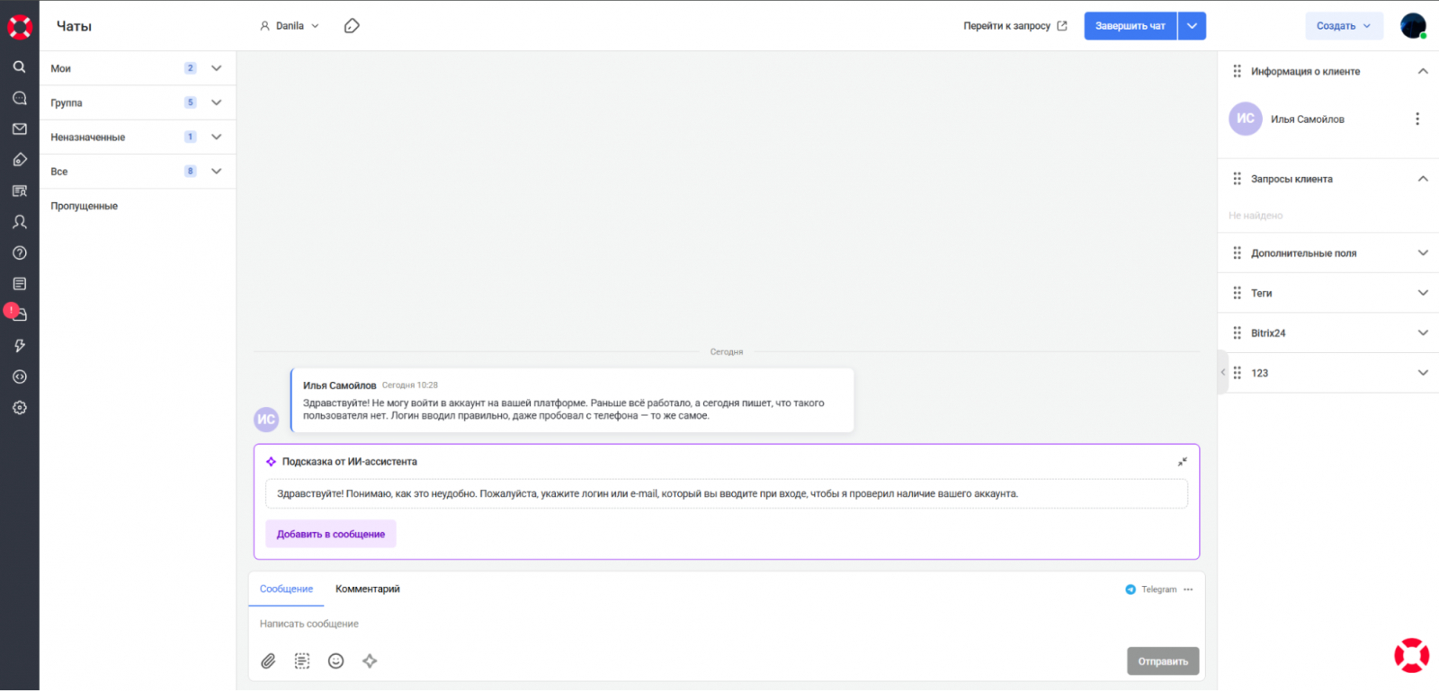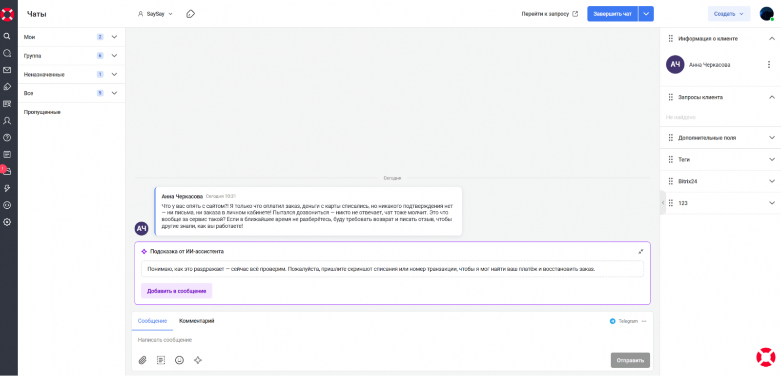 Для решения проблемы ИИ моментально предложил корректный и естественный ответ, уточнив нужные данные.