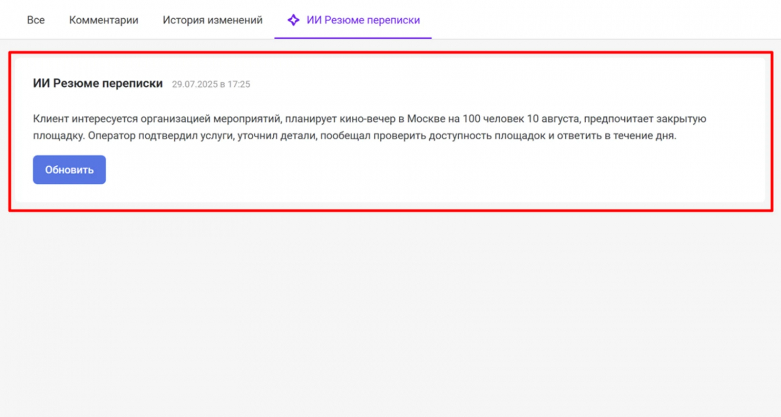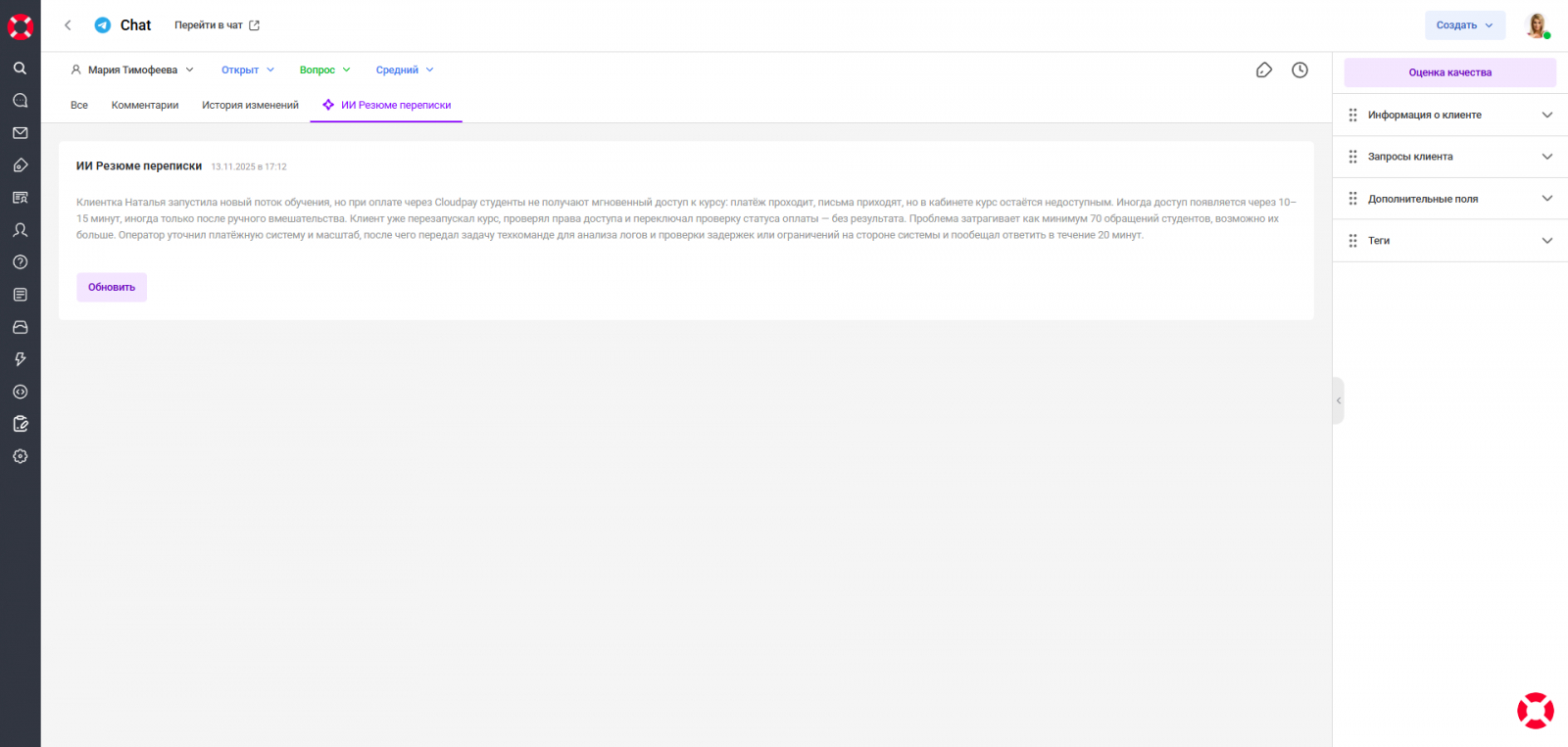 Без ИИ-резюме при передаче такого обращения другому оператору половина контекста легко теряется. Резюме сводит всё в одну чёткую выжимку: что происходит, что уже сделали и какой шаг следующий.