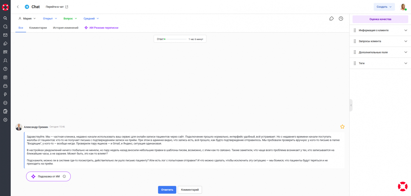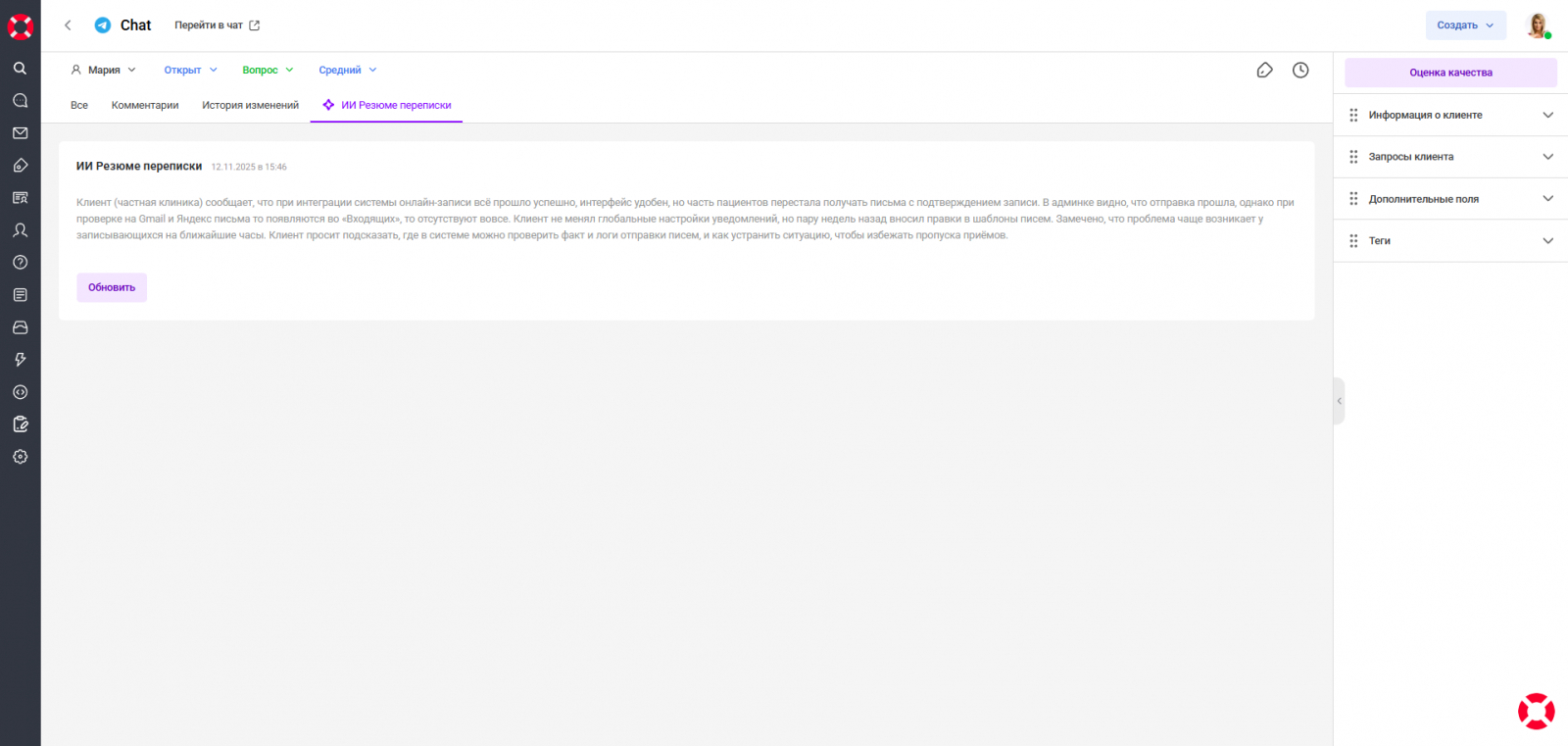 Клиенту важно, чтобы оператор видел нюансы: цифры, уточнения в середине переписки, попытки решения, о которых он писал раньше. В длинных диалогах такие моменты легко «утонут», и появляются ситуации: «Я уже писал выше». Ответы становятся точнее, а детали не теряются в переписке.